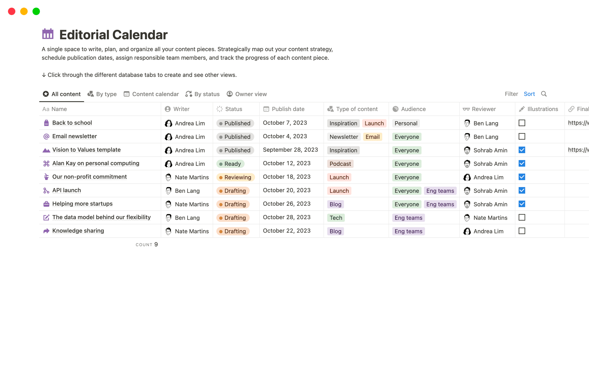 This template provides a smooth, easy way to quickly and comprehensively organize and plan your content. You can leverage it to create a editorial calendar, marketing calendar, social media cadence, blog assignment schedule, collateral development cycle, and more. Plus, the template makes it simple to add and remove tracking and attributes for better sharing, managing, and strategizing your plan.G