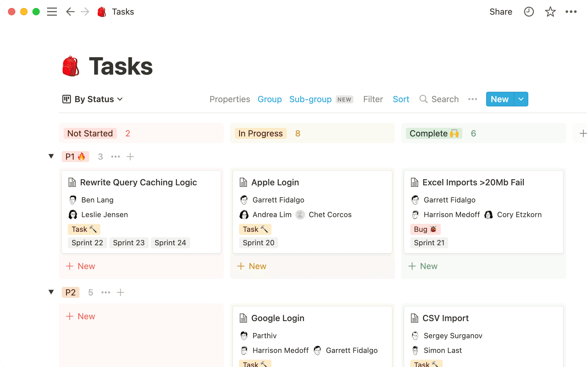 If your board was already grouped by a Status property (e.g. "Not started," "In progress," "Complete"), now you can create sub-groups of those tasks organized by Priority, Team, Assignee, or whatever property you need — all while keeping your Status columns intact.